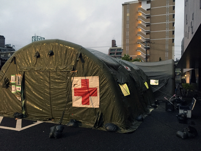 | 4月18日 | 20:00 | 熊本市医師会駐車場(仮設診療所)到着。熊本市地域医療センター小児科柳井先生に挨拶。 今後の活動について打ち合わせ。 地域医療センター内部を見学。 熊本赤十字研修中(自衛官)武先生に仮設診療所の設営について説明を受ける |